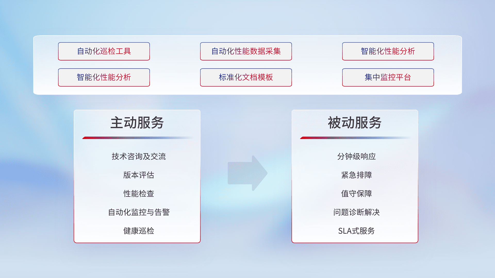 智能化工具和标准化文档,,,保障服务质量,,,提供主动服务(包含技术咨询、、、、版本评估、、、、性能检查、、、自动化监控与告警、、健康巡检)和被动服务包含(分钟级响应、、紧急排障、、、值守保障、、、、问题诊断解决、、、、SLA服务)。。。